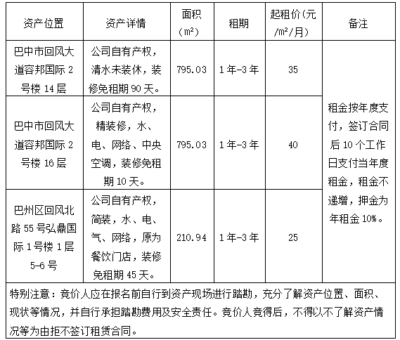 根據(jù)國(guó)有資產(chǎn)管理相關(guān)規(guī)定,巴中自然資源投資集團(tuán)有限公司決定對(duì)相關(guān)資產(chǎn)進(jìn)行公開招租?,F(xiàn)將有關(guān)事項(xiàng)公告如下: